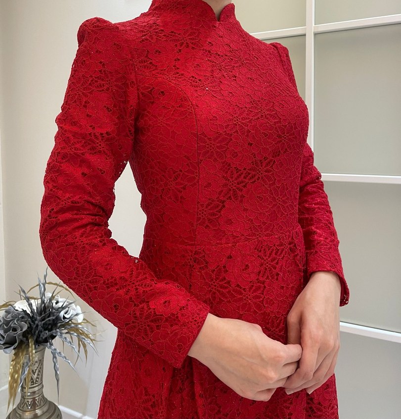 Kırmızı dantel işlemeli, yüksek yakalı ve uzun kollu, klasik şıklıkta, düğünler için uygun dar kesim elbise.