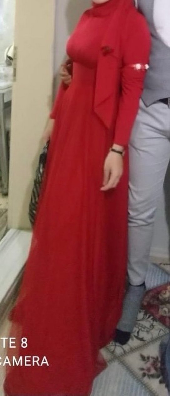 Bu kırmızı uzun elbise, uzun kollu ve yüksek yakalıdır. Pürüzsüz sentetik kumaştan yapılmış olup, drapeli tasarımı çağdaş bir hava katıyor. Düğünler için uygundur.