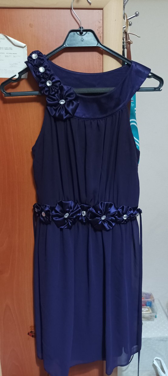 mor , pileli ve kolsuz, bel ve omuzda çiçek detaylı, klasik zarif görünümlü sentetik kumaştan kadın abiye elbise.