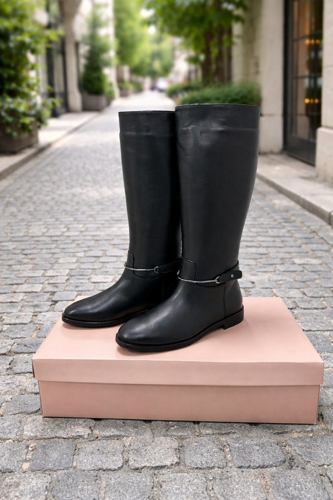 siyah deri dizüstü çizme, ince siluet ve zarif tokalı orjınal desa