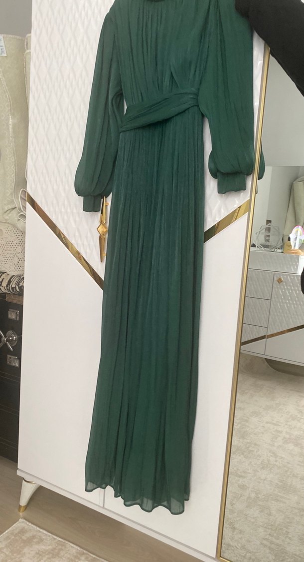 Yeşil renkte, pilili sentetik kumaştan yapılmış uzun elbise. Yüksek yakalı, salaş kesim ve askılı kollu, modern klasik tarzda, düğün için uygun.