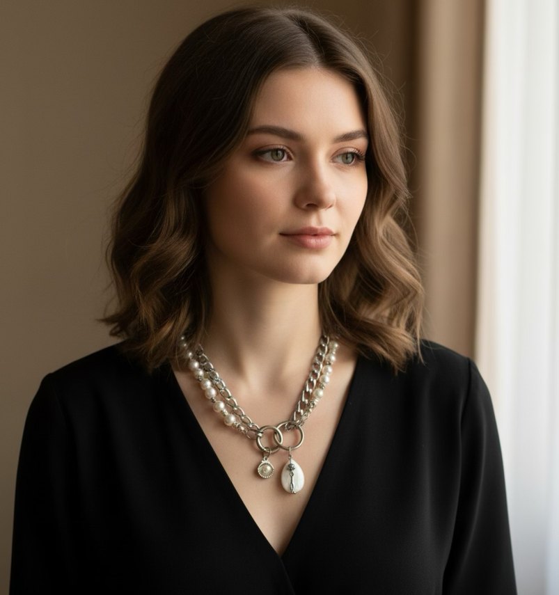 Gri tonlarda kısa uzunlukta, zincir ve inci detaylı, desen içermeyen kadın kolyesi. Günlük kullanıma uygun klasik ve çağdaş bir tasarım. ✨