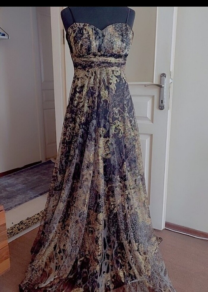 Prenses model abiye elbise. Straplez de kullanılabilir. Askılar ince saklanabilir. Herhangi bi sorunu yok tül fakat etek uclarında grater mevcut. İçi actarlı. Göğüs kısmı gloplu. 36 beden. 1 kere giyildi. Temiz ürün.