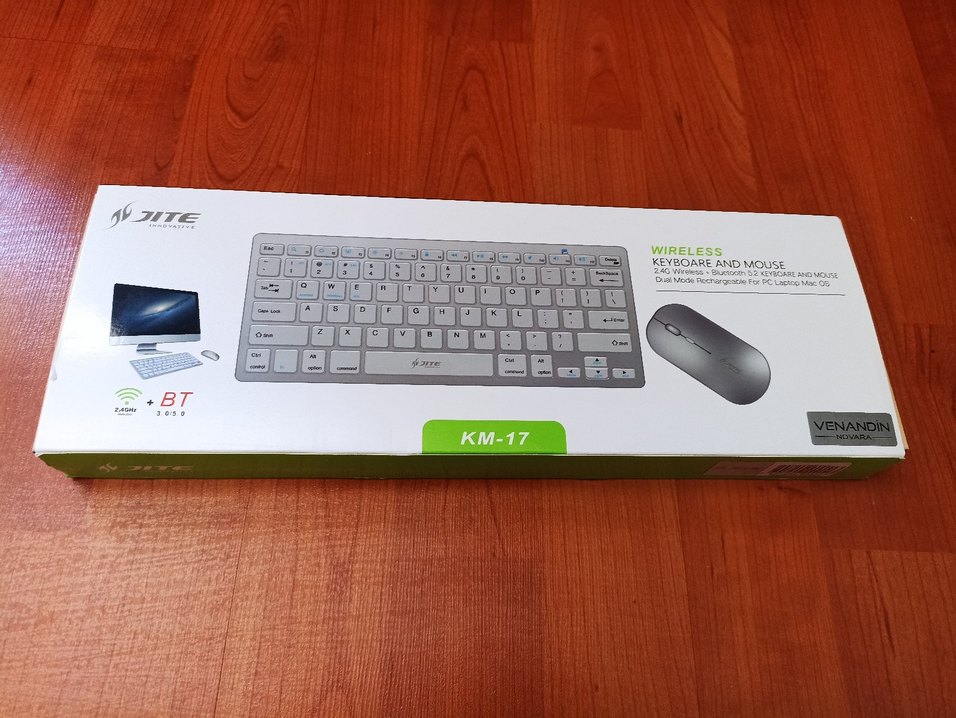 KM-17 kablosuz klavyeve mouse, beyaz ve gri tuşlarla ince tasarıma sahip, modern görünüm ve rahat yazım sunar. 2.4G kablosuz bağlantı destekler. ⌨️