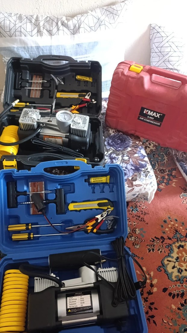 Renkli KMAX hava kompresörü, pense, tornavida ve diğer tamir aletleriyle birlikte taşınabilir kutularda düzenli şekilde sunulmaktadır. ️