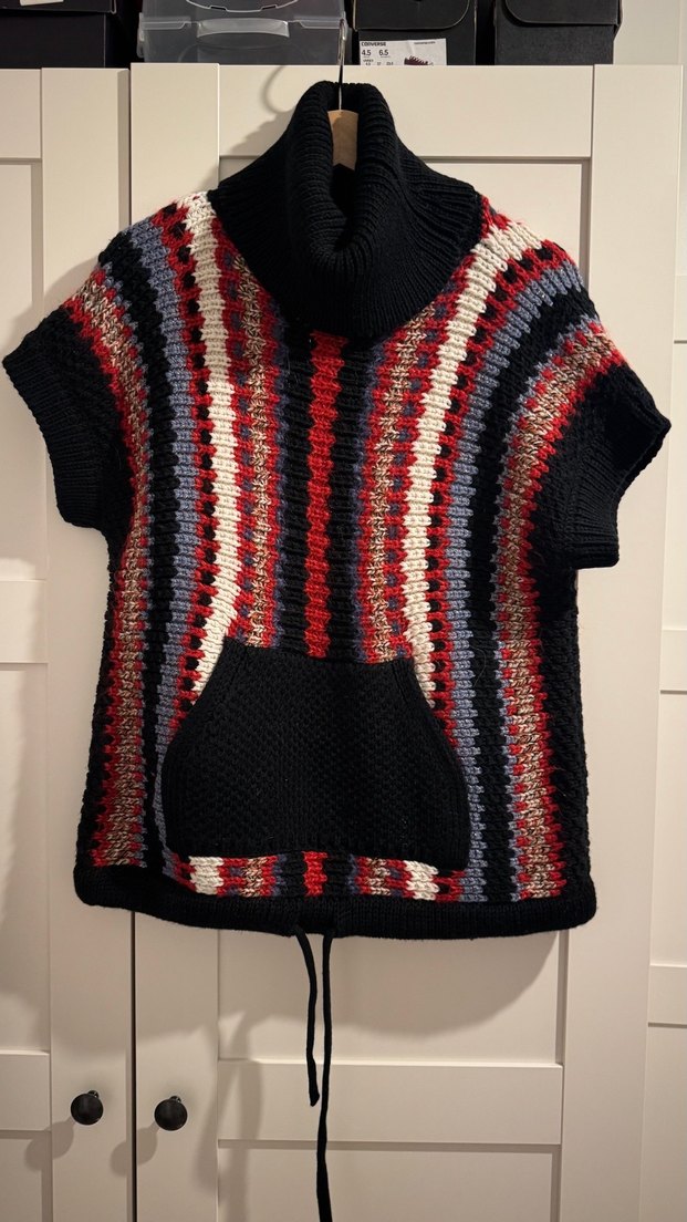 Rahat kesimli hamile süveter, boğazlı kısa kollu, yumuşak triko kumaştan, çok renkli çizgili desene sahip. Ön cep ve bağcıklı etek ucu bulunur, gündelik kullanıma uygun.