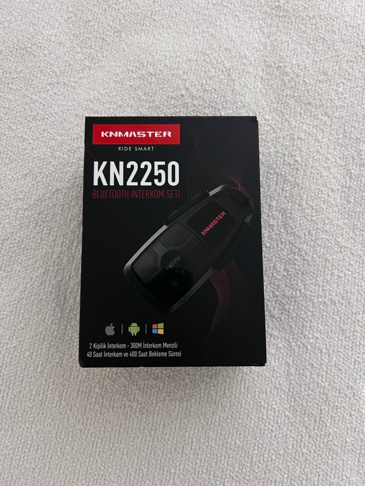 KNMASTER KN2250 Bluetooth interkom seti, siyah renkte, 300 metre menzilli ve 40 saat konuşma süresi sunar.