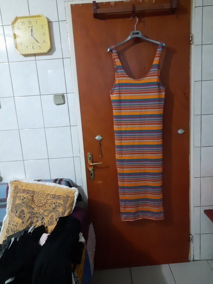 Kolsuz, ince uzun elbise, tekne yaka ve çizgili triko deseniyle hafif çok renkli. Yumuşak sentetik kumaştan, günlük rahat sokak stili için uygun. Know marka elbisemiz L bedendir olculeri resimdedir çok az kullanilmistir boy 125 dir yandan yırtmaçlıdir