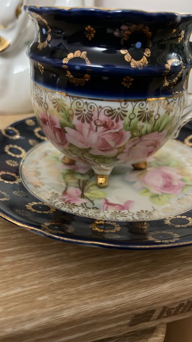 Koyu mavi zemin üzerinde pembe çiçek desenleri ve altın detaylarla süslenmiş porselen çay fincanı ve tabak seti.