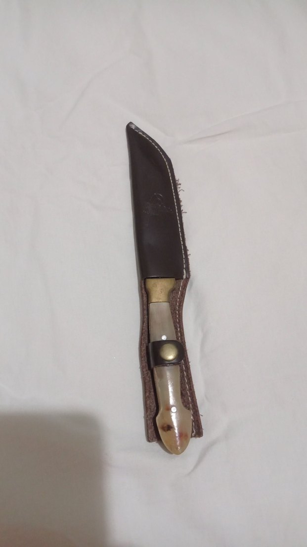 Bej saplı bıçak ve koyu renkli, düğmeli kapaklı kılıfıyla güvenli muhafaza sağlar.