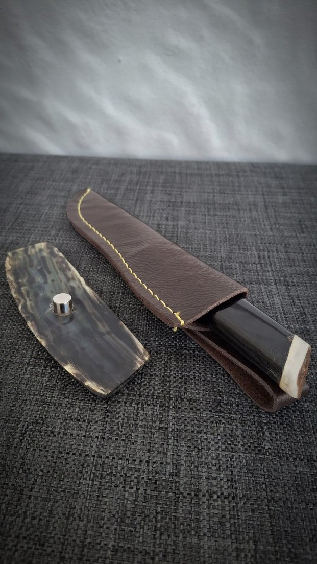Koç boynuzu kabze, geyik boynuzu detaylandırma ve koç boynuzu kaide/kılıf ile tamamlanmış özel koleksiyon avcı bıçağı. Doğal malzeme dokusu ve dengeli yapısıyla hem vitrinlik hem kullanım için değerli bir parça. Savaszade seçkisinde. Bilgi ve sipariş için mesaj bırakabilirsiniz.