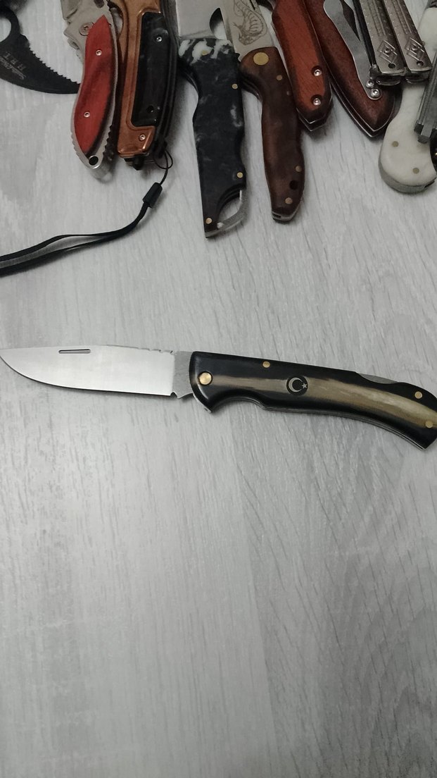 Bej ve koyu renk saplı, keskin ve katlanabilir bıçak, farklı kesme işlemleri için uygundur.