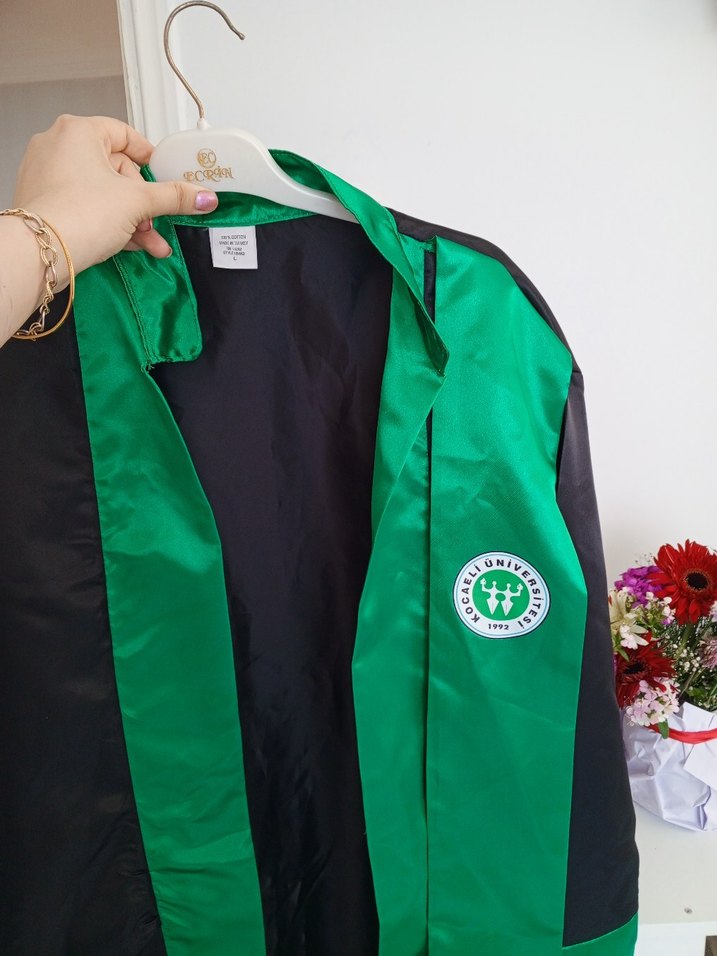 koyu yeşil renkli, yakalı mezuniyet cübbesi Uzun kollu, midi boy ve rahat kesim l beden