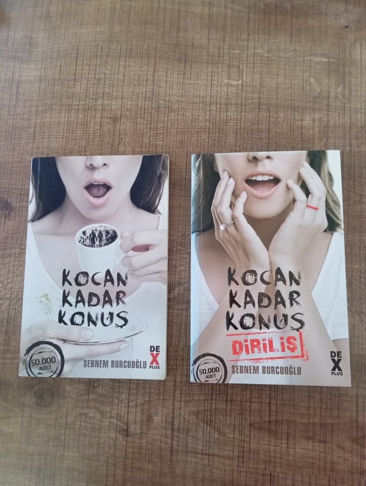 Şebnem Burcuoğlu'nun 'Kocan Kadar Konuş' ve devamı 'Diriliş' adlı iki romanı. Kapaklarda ifadeli kadın yüzleri yer alıyor.