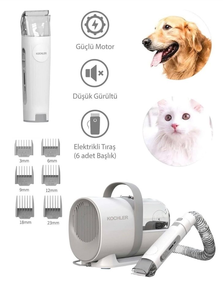 Kochler elektrikli tıraş seti, güçlü motor ve düşük gürültü ile çalışır. 3mm'den 23mm'ye 6 farklı başlık içerir. Evcil hayvan bakımı için uygundur.