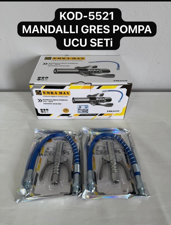 Kod-5521 model, gri renkte mandallı gres pompa ucu seti. Emka Max markasına ait, esnek hortumlu ve dayanıklı yapıda gres uygulama aparatı.️