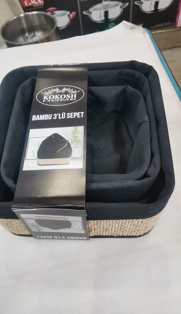 Kokosh markasının siyah kumaş astarlı, bambu malzemeden üretilmiş 3'lü sepet seti. Düzen için kullanışlıdır.