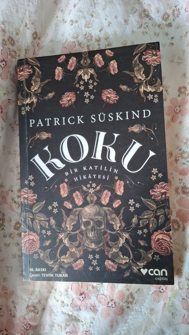 Patrick Süskind'in "Koku: Bir Katilin Hikayesi" adlı romanı, Tevfik Turan çevirisiyle. Kapakta çiçek ve kafatası desenleri bulunuyor.