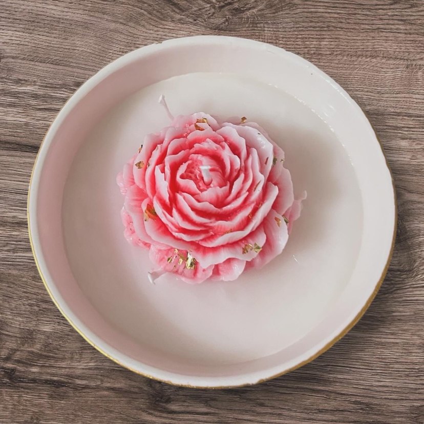 Pastel pembe renkte, gül şeklinde ve gold detaylı porselen Kasede mum