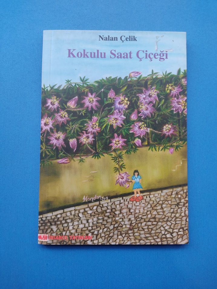 Nalan Çelik'in Kokulu Saat Çiçeği adlı hikaye kitabı, mor çiçeklerle dolu canlı bir kapak ve taş döşeli yolda yürüyen küçük bir figür içerir.