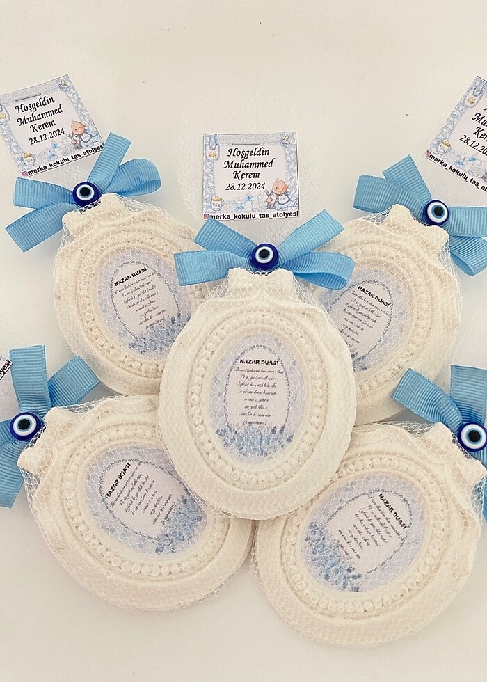Tanesi 18 tl. 20 adet fiyatıdır.Magnettir.İnci yada nazar boncuğu tercih edilebilir.Saten kurdele kullanılmıstır