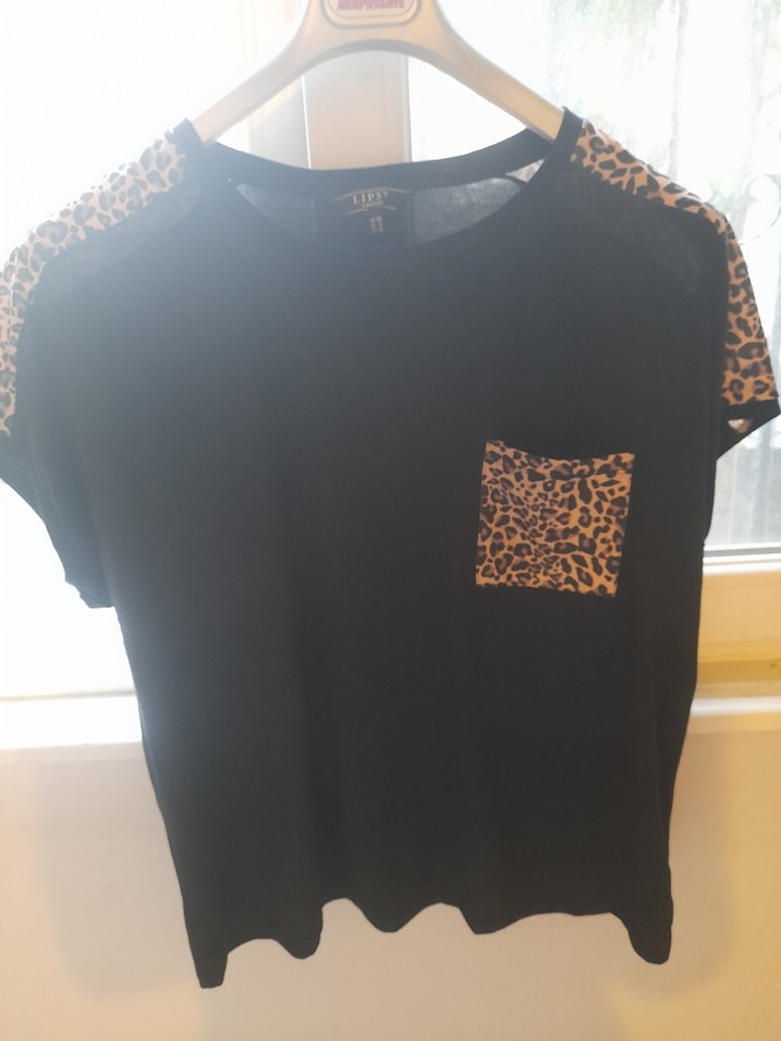Kısa kollu ve yuvarlak yakalı siyah kadın tişörtü, omuz ve cep kısmında leopar desenlidir. Rahat kesimli, sentetik kumaştan, günlük sokak stili için uygundur.