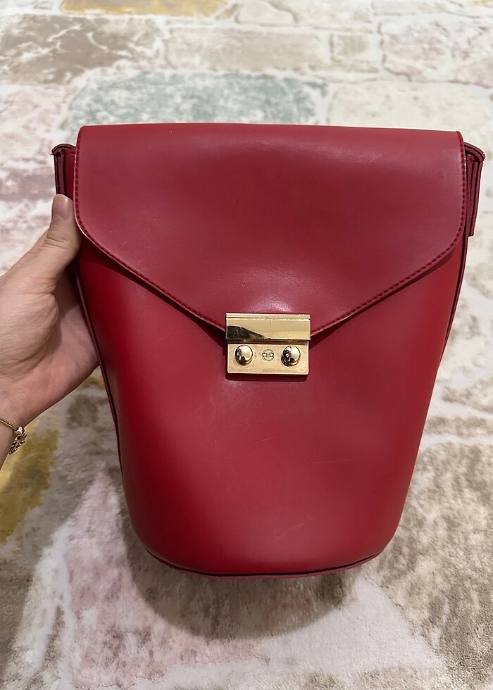 Koton marka. İçinde ve dışında hasar yok. Kulplarının birleştiği yer eskidi. Siz yeni kulp taktırabilirsiniz. Mat kırmızıdır