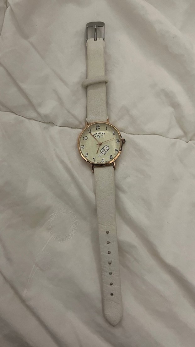 Beyaz kemerli kol saati, sade yuvarlak kadran ve net rakamlarla tasarlanmıştır.