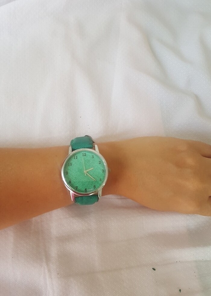 İç mekanizması ve kordonu yeşil renkte özel tasarım kol saati. Çok az kullandım. Çekmecemde duruyordu, zamanla sanırım nemden dolayı kordonu soyulmuş. Sadece kordonu değiştirilerek kullanılabilir. Saat mekanizmasında hiçbir sorun yoktur.