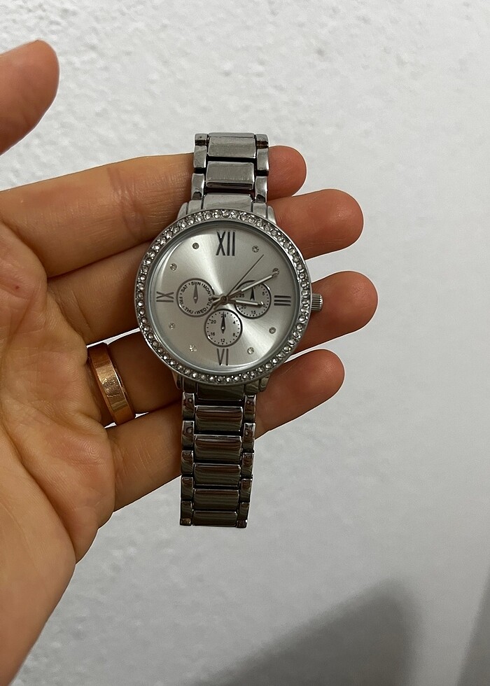 Gümüş renk kadın kol saati taş detaylı. H&M markadır. Hediye geldi kullanmadım. Pili değiştirilecektir. Herhangi bir defosu yok her şey fotoğraflarda göründüğü gibidir.18cmdir
