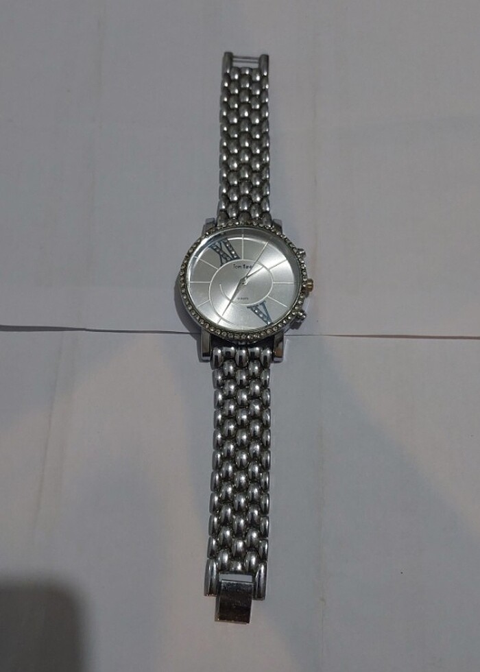Gümüş renk taşlı saat. Batarya alınacak. Dört adet taşı düşmüş kalanı hepsi duruyor çok güzel saat