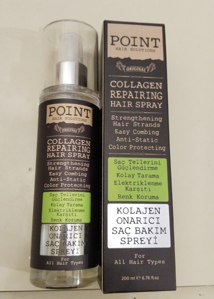 Saç tellerini güçlendirmeye kolay taramaya elektriklenmeye ve renk korumaya faydaları olan kolajen onarıcı çok hoş kokulu saç bakım spreyi. Ürünü kullandım sıfır değil. Ürünün geri iadesi yoktur. #kolajen#saçonarım#kolaytarama#elektriklenmekarşıtı#renkkoruma#bakımspreyi#pointhairsolutions