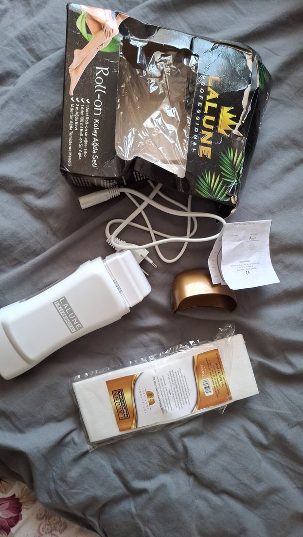 Kalıcı ağda seti, beyaz ısıtıcı cihaz, ağda bantlar ve altın renkli kapak içerir. Kullanım kılavuzu ile birlikte. Kullanılmadı. ağda bezi ve üç tane Agiss temizleme mendili. iade kabul etmiyorum