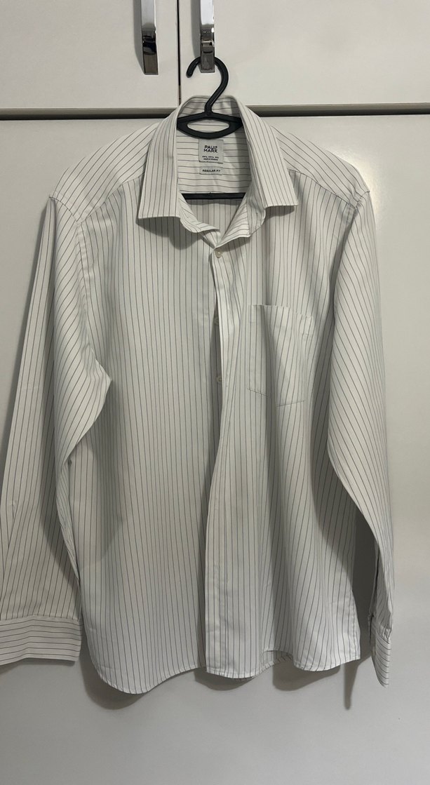 Uzun kollu, yakalı ve düğmeli mavi çizgili erkek gömleği. Normal kesim, ofis veya günlük kullanıma uygun, sentetik kumaştan.