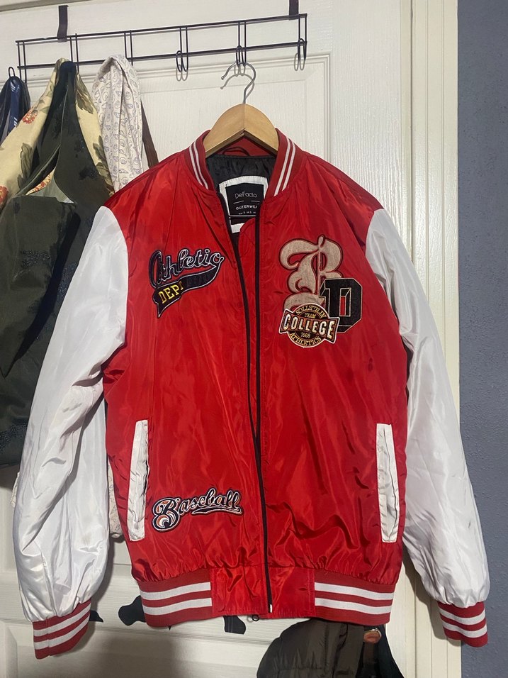 Parlak kırmızı sentetik kumaştan, uzun kollu ve bol kesim erkek spor ceket.Kusurlar belirtildi