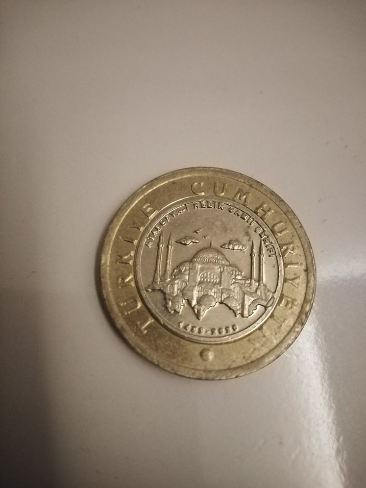 Altın renginde, tarihi bir cami ve "Türkiye Cumhuriyeti" koleksiyon para