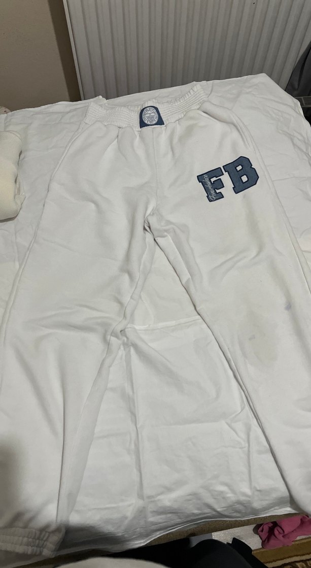 Yumuşak ve sıcak kumaştan, düğmeli ve bol kesim beyaz kadın eşofman altı. Spor ve günlük kullanıma uygun, 'FB' logosu bulunur.
