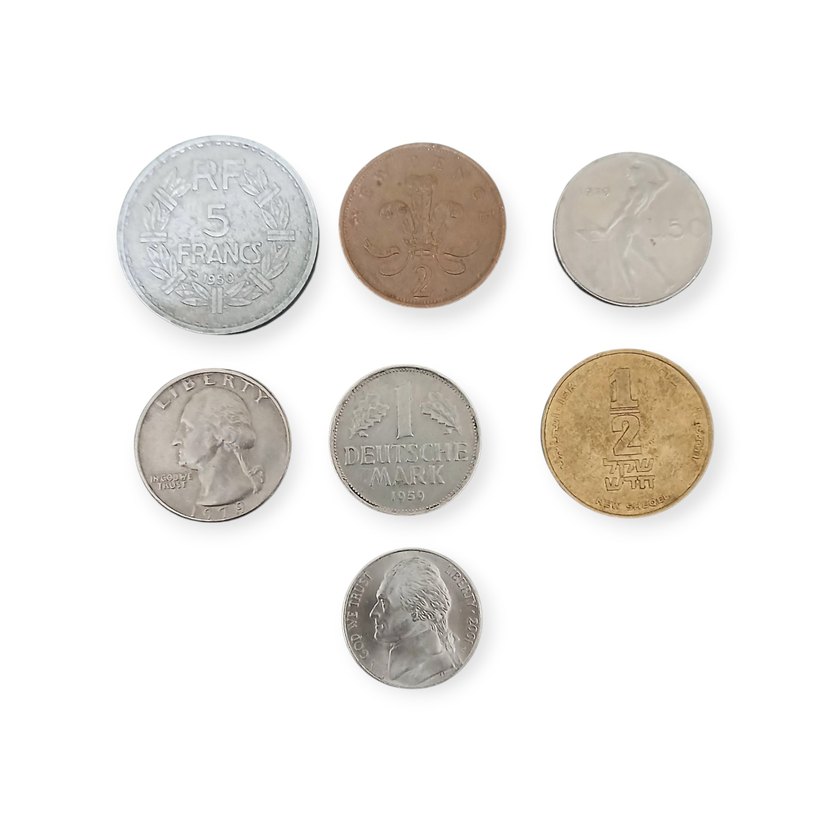 1 adet 5Francs 1950 1 adet 2 New pençe 1 adet 50 lire 1979 İtalya 1 adet 1 mark 1959 1 adet 1979 Quarter dollar 1 adet five cents 2001 1 adet 1/2 israil toplu satılık