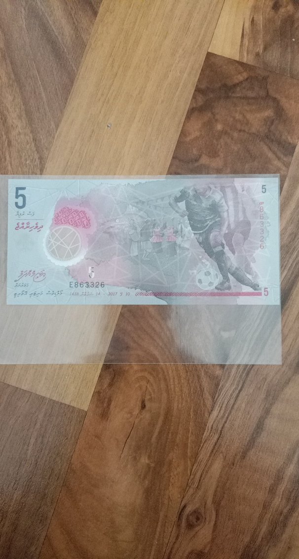 5 birim değerinde, açık kamel renkli detaylı tasarıma sahip banknot. E863326 seri numarası ve spor temalı görseller içerir. ⚽