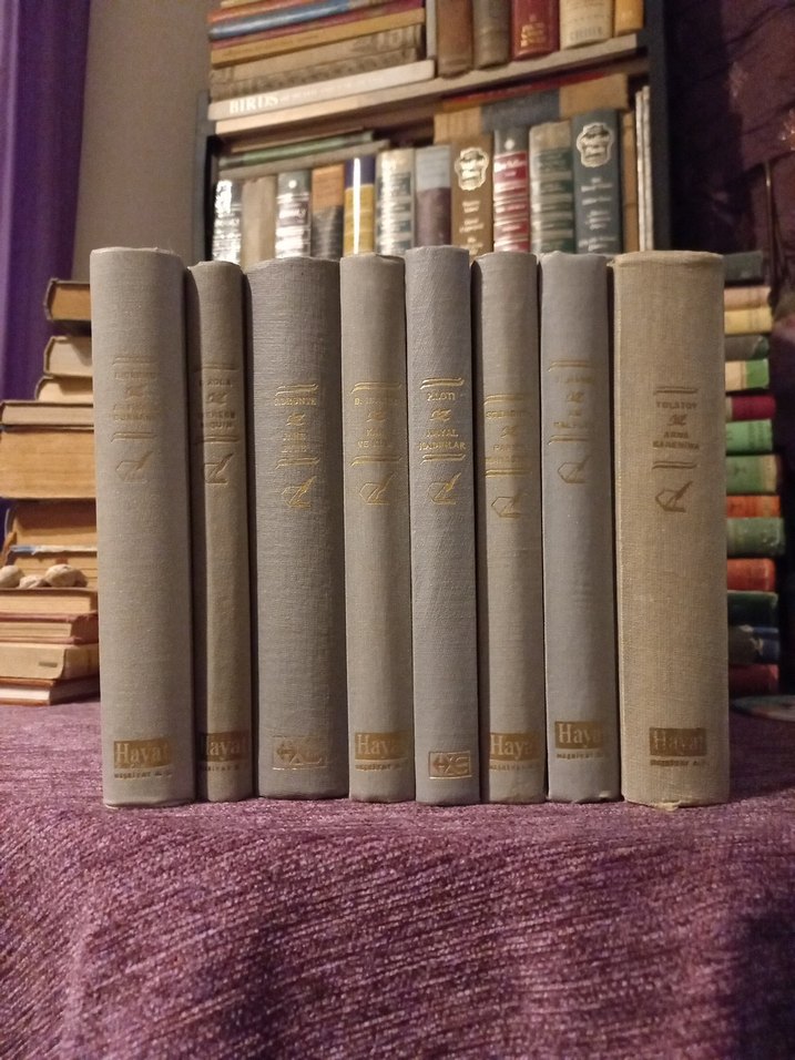 Klasik gri kapaklı, altın yaldızlı başlıklı eski ciltli kitaplardan oluşan koleksiyonluk set. Kendi koleksiyonumu bozmak zorunda kaldığım için en sevdiklerimi satışa ekliyorum. Jane Eyre, Anna Karenina gibi çok önemli koleksiyon kitapları var. Toplu fiyat. Hepsi çok sağlam ve temiz. Toplam 8 adet.