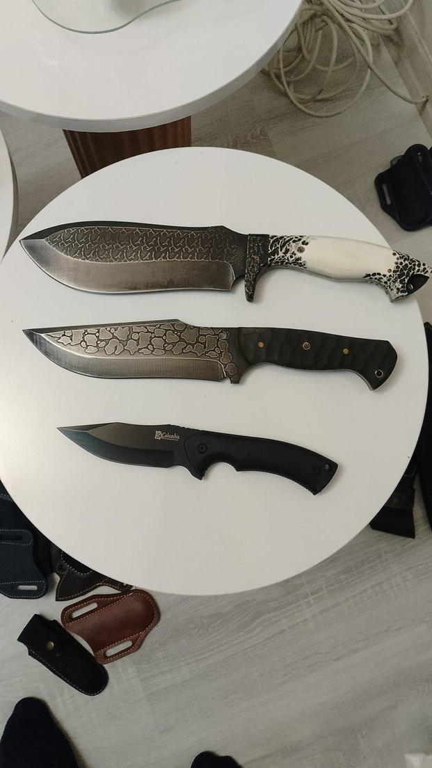 Üç farklı sap tasarımına sahip, desenli koyu gri bıçaklardan oluşan set.
