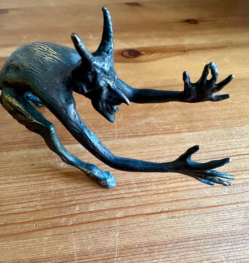 Bu heykel gerçekten etkileyici —abartılı anatomisi, öne doğru uzanan kolları ve o vahşi yüz ifadesiyle adeta bir karanlık masal karakteri gibi duruyor. Boynuzlar, dil ve diş detayları özellikle dikkat çekici; sanki bir efsaneyi ya da lanetli bir objeyi koruyan yaratık havası var.'' Sanatın karanlık yüzüyle tanışın; Bu eşsiz bronz heykel, grotesk detayları ve dinamik formuyla mitolojik bir yaratığın öfkesini ve gücünü yansıtıyor. Uzun parmaklarıyla ileriye uzanan figür, keskin dişleri ve dışa sarkmış diliyle adeta bir lanetin beden bulmuş hali. İki boynuzlu baş yapısı ve kambur duruşu ile gotik ve fantastik sanatın en çarpıcı örneklerinden biri... ️ El dökümü bronz – yüksek kalite, zamana meydan okuyan dayanıklılık Doğal patina – yılların verdiği karakter ve derinlik Boyutlar: 14x7 cm Bu parça yalnızca bir dekor değil; bir hikâye anlatıyor. Koleksiyonlara, gotik iç mekanlara veya fantastik sanat galerilerine mükemmel uyum sağlar. #koleksiyon vintage  #heykel  #figür