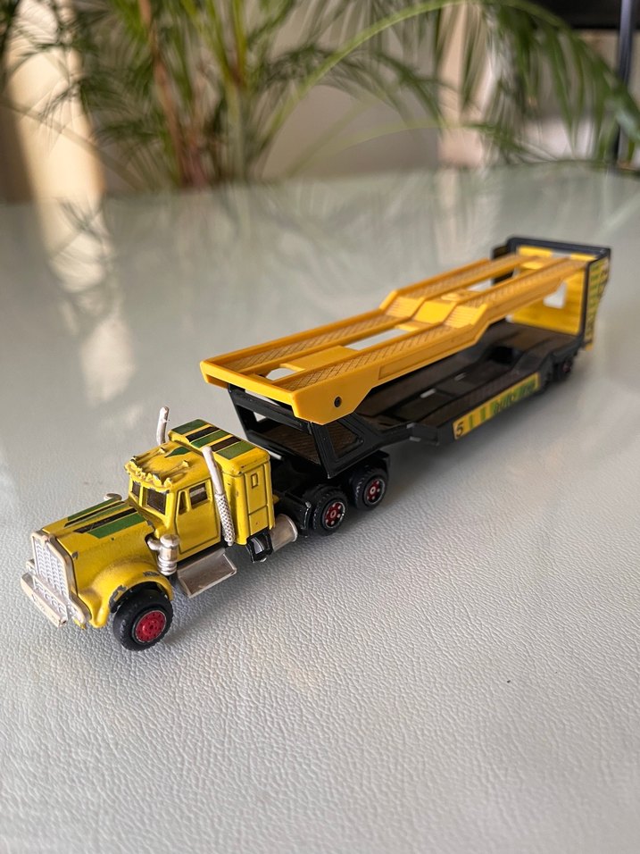 Koleksiyonluk Vintage Majorette Kenworth Otomobil Taşıyıcı Tır: Fransa’da üretilmiş, 1:87 ölçekli Majorette Sarı Kenworth Otomobil Taşıyıcı Kamyon ve Treyler modeli: 1980’lerden başlayıp 90’ların ortalarına kadar üretilen Kenworth tırı Fransız dökümü olup, 1992 öncesine aittir. Majorette Oto Taşıyıcı, ayarlanabilir rampalara sahip bir römork içerir. Majorette Kenworth kabininde, krom plastik motoru ortaya çıkarmak için öne doğru açılan bir kaput bulunur. 1980’lerden kalma, Fransa’da üretilmiş, 1:87 ölçekli Majorette Sarı Kenworth Otomobil Taşıyıcı Kamyon ve Treyler modeli mükemmel durumda olup, tüm orijinal çıkartmaları da dahil olmak üzere birçok detaya sahiptir. Lastikler kusursuz bir şekilde dönüyor ve motor kaputu açılıp kapanabiliyor. Treyler, ortalama 1:64 ölçekli dört aracı taşıyabilir ve araç yüklemek için arka rampası ve üst güvertesi açılıp kapanabiliyor. Hem kamyon hem de treyler birbirine takılıp çıkarılabiliyor.