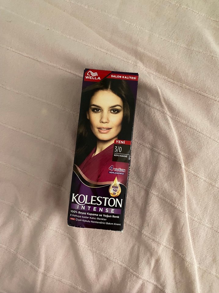 Koleston Intense 3/0 Koyu Kahve saç boyası, %100 beyaz kapatma ve yoğun renk sunar, besleyici bakım içerir. Saçımı boyamaktan vazgeçtiğim için satıyorum
