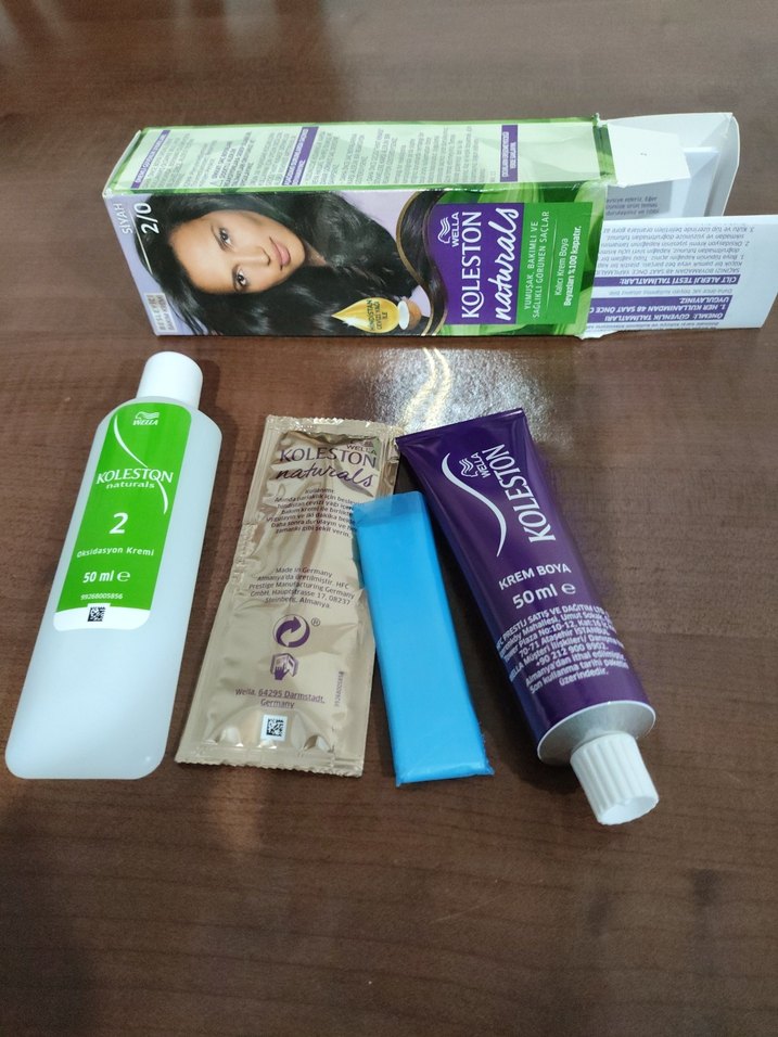 Koleston Naturals saç boyası seti, krem boya, oksidan ve bakım kremi içerir, doğal görünümlü saç rengi sağlar.