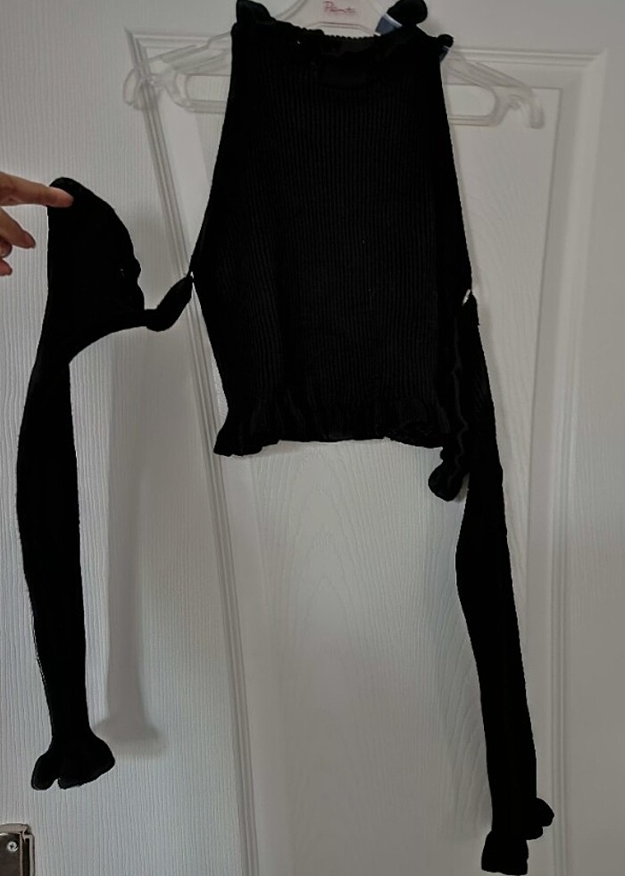 Milla ürünü, kolları ve boynu fırfırlı, kolları ayrı bluz. kaymasını önleme amacıyla arada bir ip mevcuttur