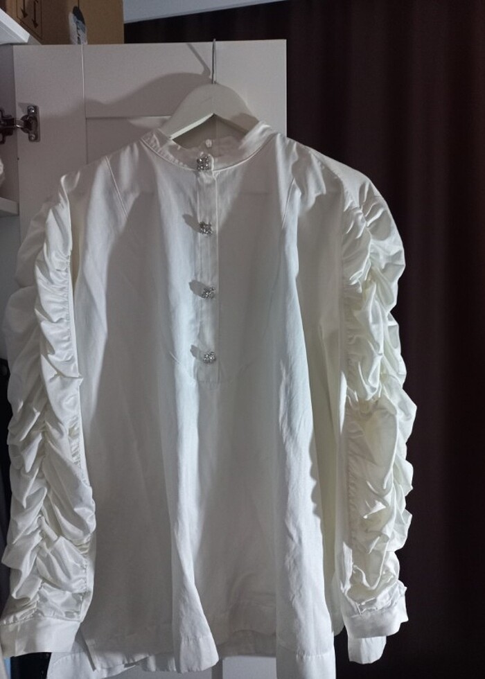 Sayili giyildi, tertemiz. Kollari buzgulu ama sıkı degil. Tas detayli, arkasi fermuarli krem rengi gomlek