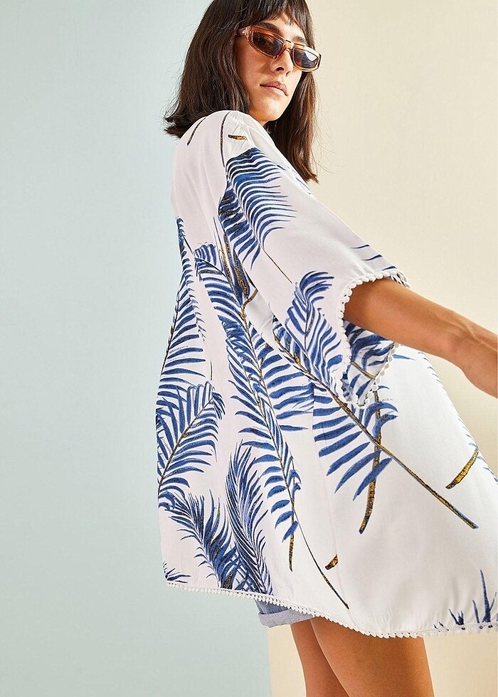 Kolları dantel detaylı desenli viskon kimono