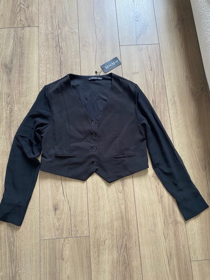 Siyah renkte, düğmeli Kolları şifon yelek ceket