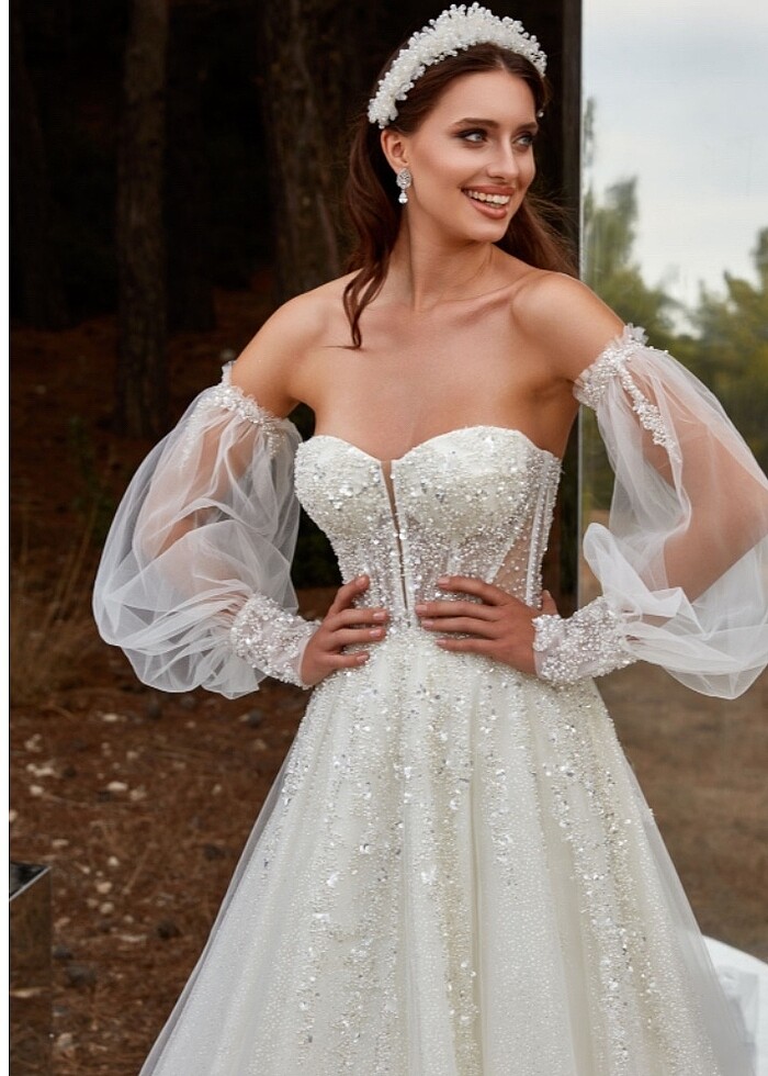 Kolları tül detaylı parıltılı Helen Gelinlik